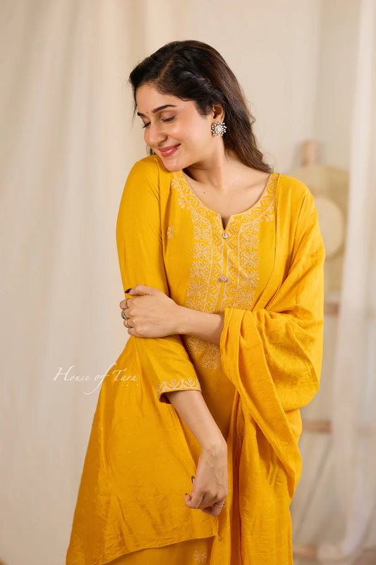 Affordable Embroidered Rayon Kurti Set in Mustard yellow